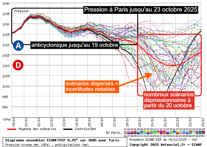 Différents scénarios de pression à Paris du 9 au 23 octobre 2025 - meteociel.fr