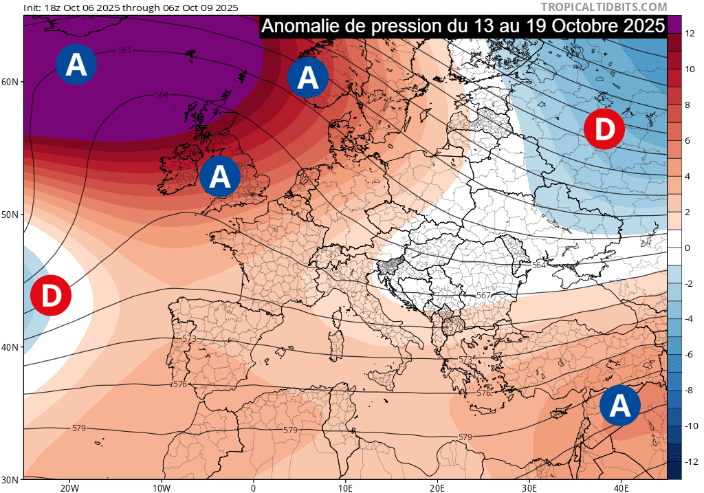 Lorsque l'on regarde les tendances, il apparaît donc clair que la deuxième décade du mois d'octobre 2025 sera dominée par le blocage anticyclonique et donc par une météo calme en France. Cela est corroboré par la carte ci-dessous, qui montre l'anomalie de pression prévue en semaine du lundi 13 au dimanche 19 octobre 2025. Le blocage anticyclonique devrait perdurer sur les Îles Britanniques, tout en remontant progressivement vers l'Islande puis les hautes latitudes. En France, un flux continental dominera avec un air sec et une météo souvent lumineuse.