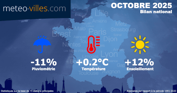 Comme à chaque début de mois, nous vous proposons un nouveau bilan climatologique. Place désormais au bilan cartographié d'OCTOBRE 2025 en termes de température, pluviométrie et ensoleillement sur un panel de 73 stations*. Les anomalies présentées sont calculées à partir des moyennes climatiques de la période de référence 1991-2020 sur l'ensemble des stations du panel.