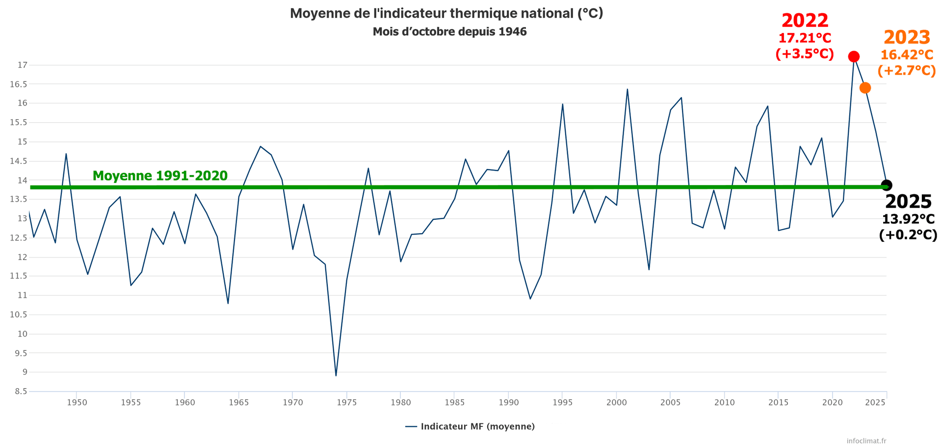 Indicateur thermique national pour octobre 2025 depuis l'après-guerre (1946) - Infoclimat