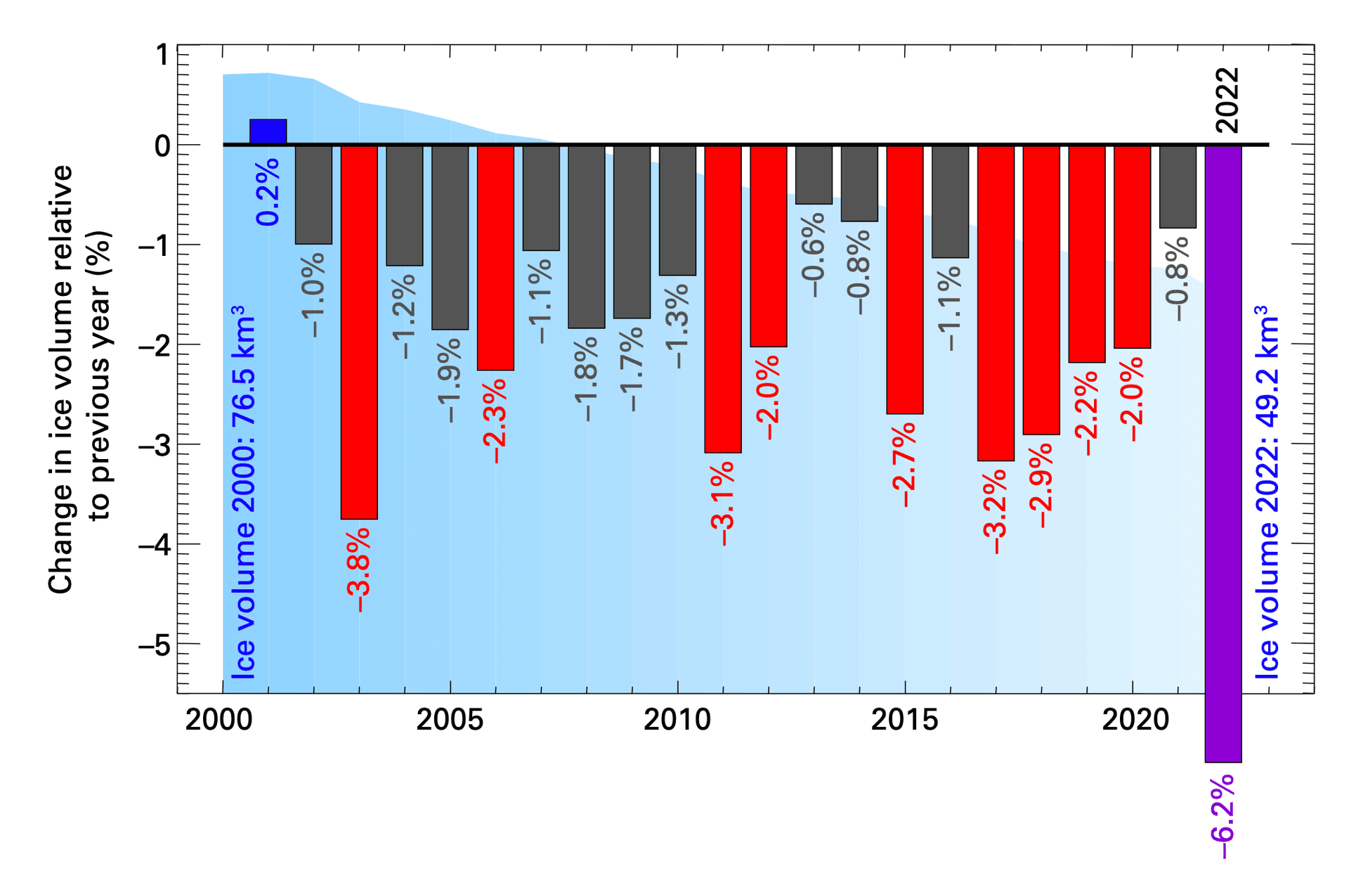 Variation annuelle du volume des glaciers en Suisse par rapport à l'année précédente - période d'observations entre 2000 et 2022 // Données : Matthias Huss - Swiss Glacier Mass Balance (2022)