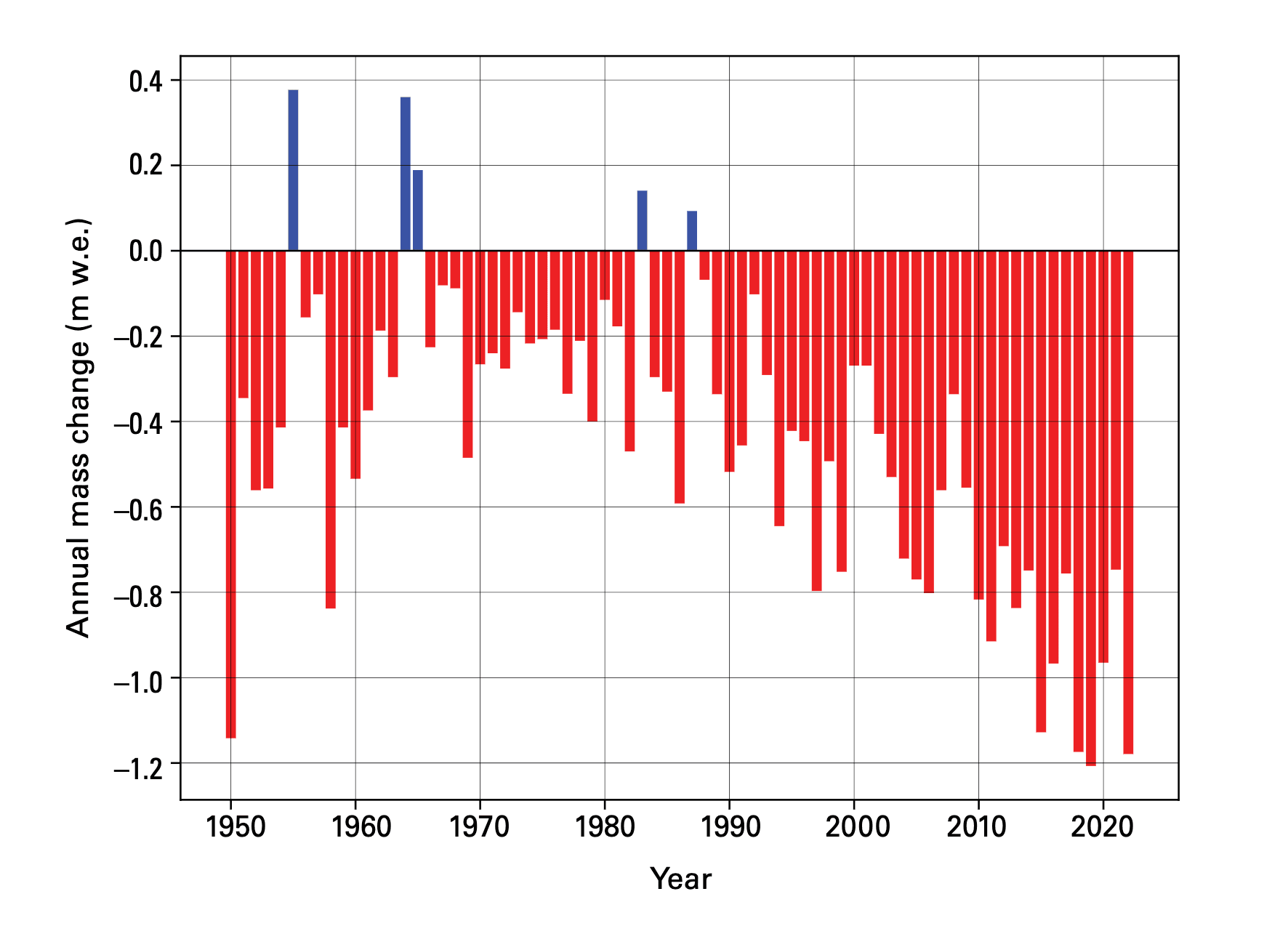 Sur l’année hydrologique 2021/2022, les observations font état d’un bilan de masse moyen de -1.18m w.e., soit une perte beaucoup plus importante que la moyenne des dix dernières années. Il s’agit également de la 2e fonte la plus importante depuis le début de la série de mesures en 1950 (derrière la saison 2018/2019). Au total, la perte cumulée depuis le début des années 1970 atteint les 26m d’équivalent eau. Six des dix années avec les plus grandes fontes se sont produites depuis 2015 pour ce panel mondial de glaciers.