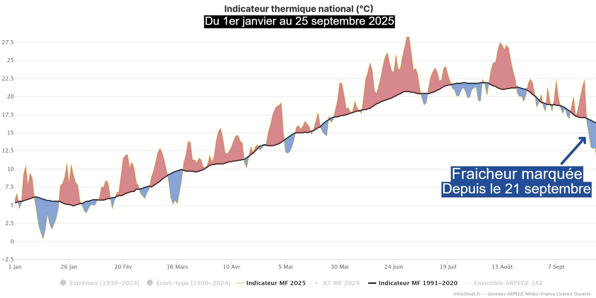 Évolution de l'indicateur thermique sur la France du 1er janvier au 25 septembre 2025 – Via infoclimat.fr