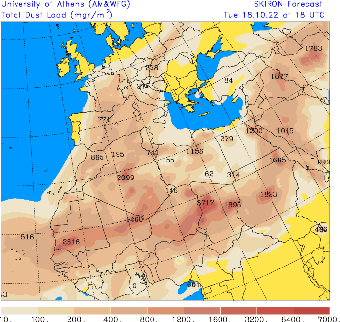 Modélisation des quantités de poussière de sable pour le mardi 18 octobre 2022 - via SKIRON