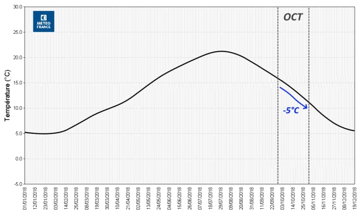 Avec de telles valeurs prévues, nous sommes en droit de nous demander si des records vont être battus. Dans les faits, il serait peu judicieux de s'intéresser aux records mensuels. En effet, le mois d'octobre est celui au cours duquel la baisse des températures est la plus forte en France. Encore située autour de 16°C à échelle nationale au début du mois, la température moyenne du pays tombe autour de 11°C à la fin de ce dernier - soit une chute de 5°C en un mois. Ainsi, les records mensuels de chaleur datent presque tous des premiers jours du mois.