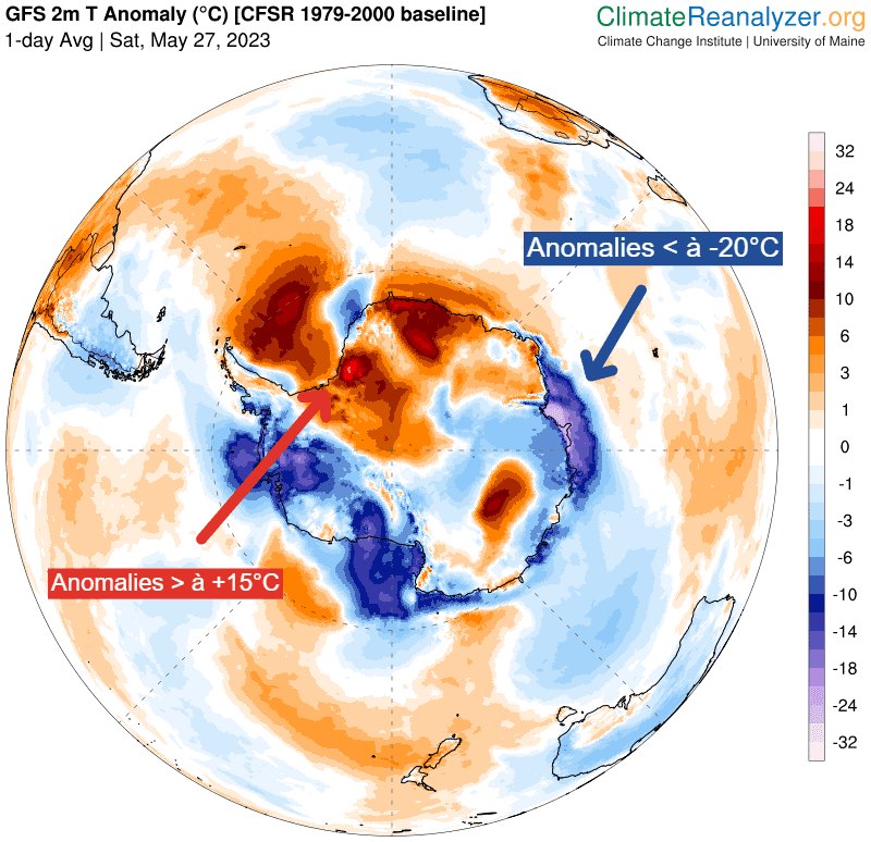 Anomalies de températures sur l'Antarctique ce 27 mai 2023 – Via Climate Reanalyzer