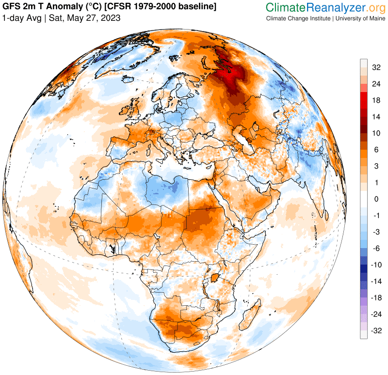 Anomalies de températures en Afrique ce 27 mai 2023 – Via Climate Reanalyzer