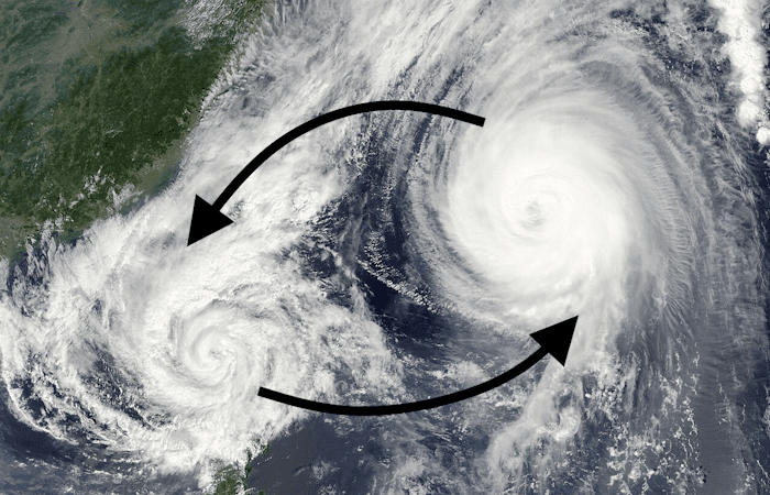 Nommé en 1921 par le météorologue japonais Sakuhei Fujiwhara, l'effet Fujiwara (qui s'écrit avec ou sans le H) décrit l'interaction qui survient entre deux cyclones tropicaux lorsque ces derniers évoluent à proximité l’un de l’autre. Lorsqu'ils se rapprochent à moins de 1.400 kilomètres de distance, leurs circulations atmosphériques respectives commencent à s'influencer. Au lieu de suivre une trajectoire indépendante, les deux systèmes entrent dans une sorte de danse tourbillonnante autour d’un point commun, un peu comme deux patineurs se saisissant par les mains.
