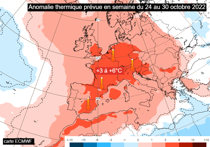 Tout semble indiquer sur cette anomalie douce à chaude se prolongera jusqu'au terme du mois. Les dernières modélisations pour la semaine du lundi 24 au dimanche 30 octobre 2022 maintiennent un flux de sud-ouest toujours vecteur d'un air anormalement doux sur la France. Le modèle européen envisage une anomalie thermique de +3 à +6°C sur une bonne partie du pays pour la dernière semaine d'octobre. À cette heure, aucun épisode de froid ou de fraîcheur sensible n'est envisagé...