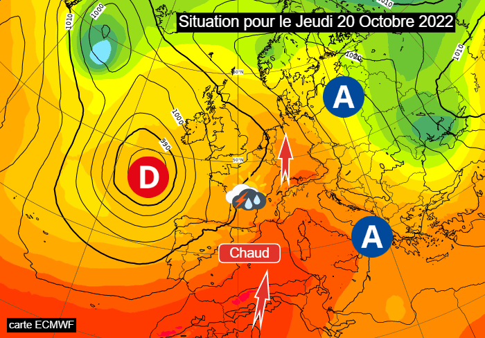 Une dépression est actuellement centrée au large sur l’Atlantique. Pendant ce temps, un anticyclone s’étend du bassin méditerranéen à la Mer du Nord. La position de ces centres d’action réunit les conditions à un flux de sud dynamique sur la France, prenant ses racines sur le nord de l’Afrique ! Ce dernier contribue à faire remonter une masse d'air remarquablement chaude pour la période, d'autant que la dépression océanique stagne et que le flux reste durablement méridien.