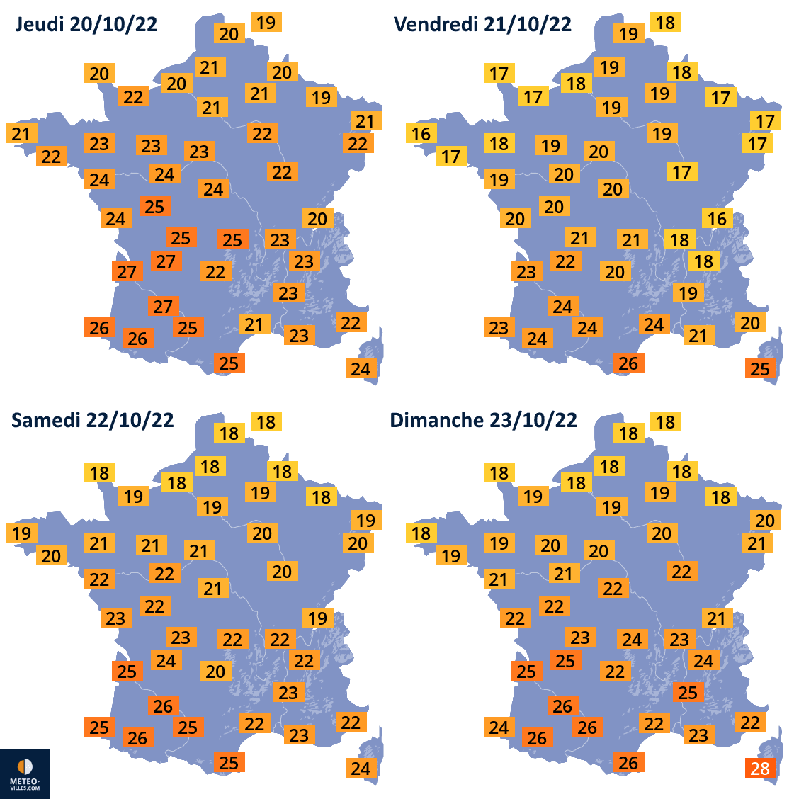 Températures maximales prévues du jeudi 20 au dimanche 23 octobre 2022 - Météo Villes