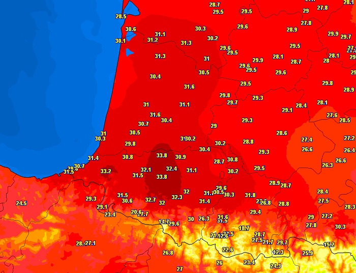 Les températures sont montées encore plus haut dans le Pays Basque et le Béarn où les 30°C étaient dépassés de façon généralisée. Deux stations se partagent la valeur la plus élevée de la journée avec 33,8°C à Orthez ainsi qu'à Navarrenx ! Jamais une telle chaleur n'avait été enregistrée si tard dans la saison. Toujours dans les Pyrénées-Atlantiques, on a relevé 33,2°C à Cambo-les-Bains, 32,4°C à Lagor et 32,3°C à Oloron.