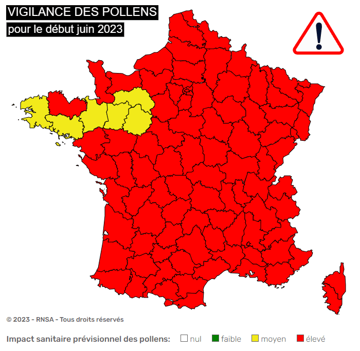 Carte de vigilance des pollens pour le début du mois de juin 2023 - via RNSA