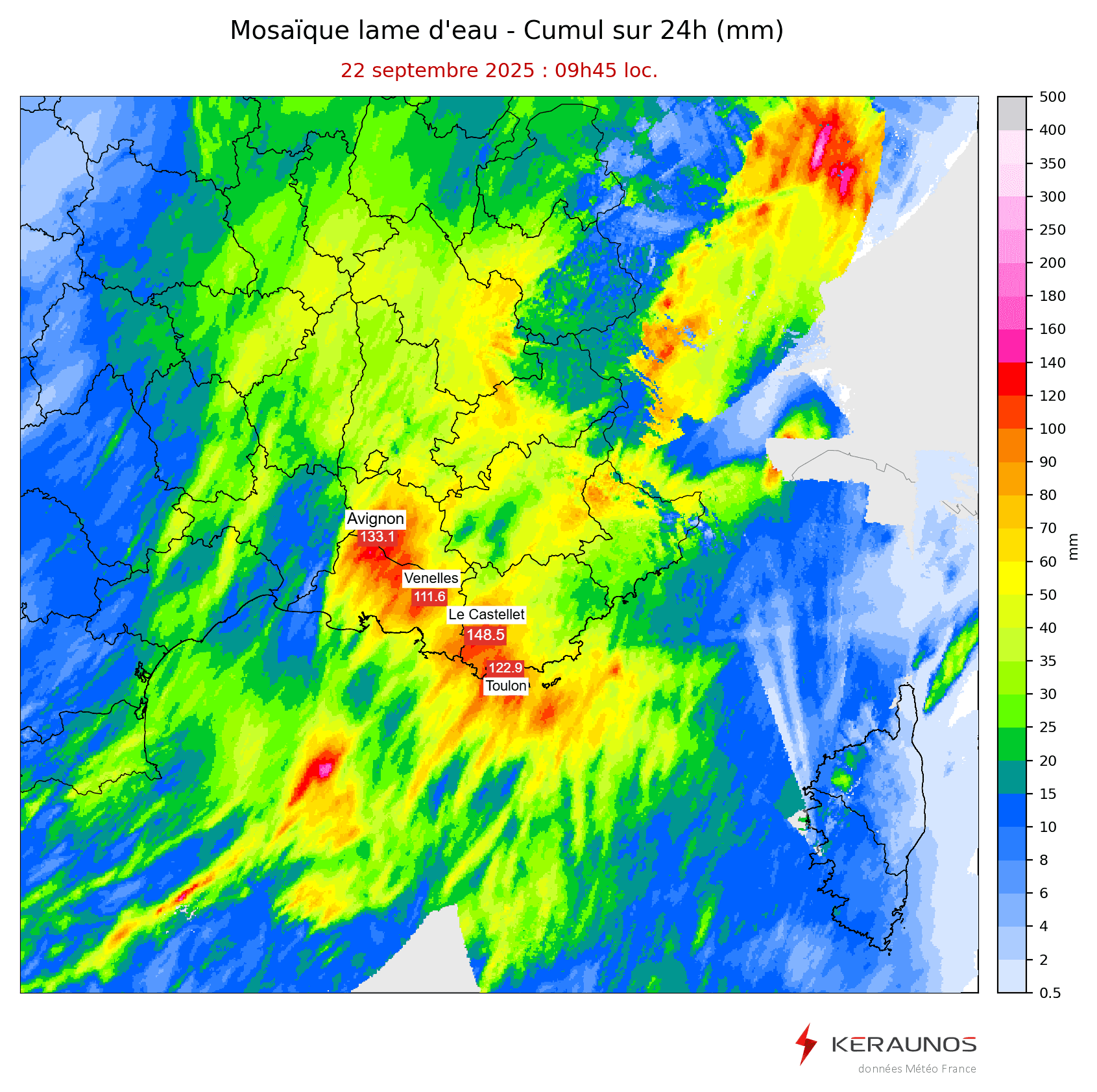 C'est notamment dans le Vaucluse que les intensités se sont montrées les plus importantes. On a par exemple pu relever 111.3mm en seulement 3 heures à Avignon, un nouveau record pour cette station sur ce laps de temps devant les 91,4mm relevés en 2010.