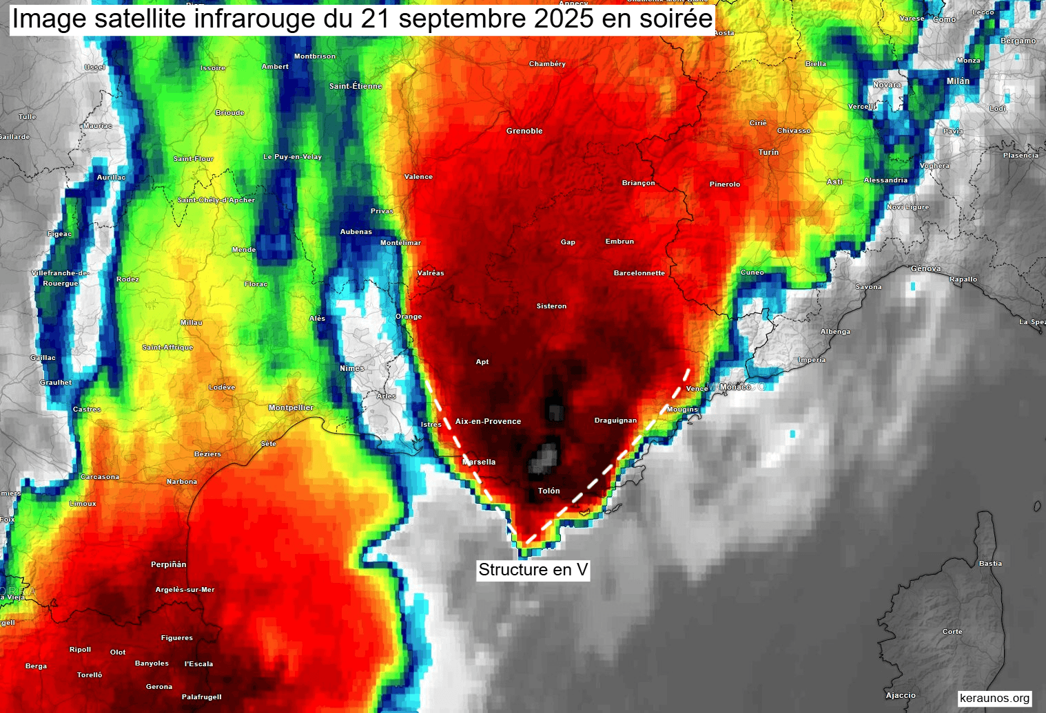 On notera également que l'orage diluvien a adopté une structure particulièrement aboutie sur le Var en soirée du 21 septembre, adoptant une structure caractéristique d'orage en V. Outre la pluie, l'intensité électrique fut également remarquable sous cet orage avec jusqu'à 13 000 éclairs en seulement une heure !