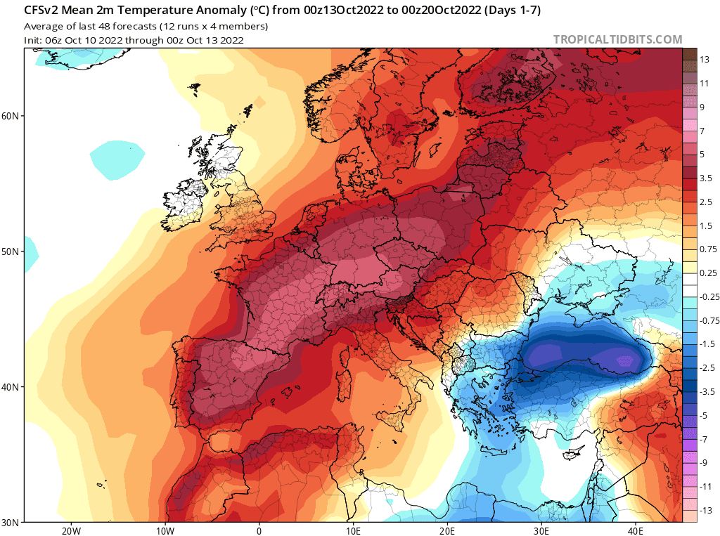Anomalie thermique modélisée sur l'Europe entre le 13 et le 20 octobre 2022 - via tropicaltidbits.com