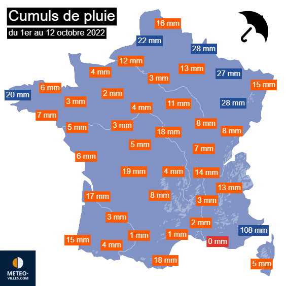 Cumuls de pluie en France entre le 1er et le 12 octobre 2022 - Météo Villes