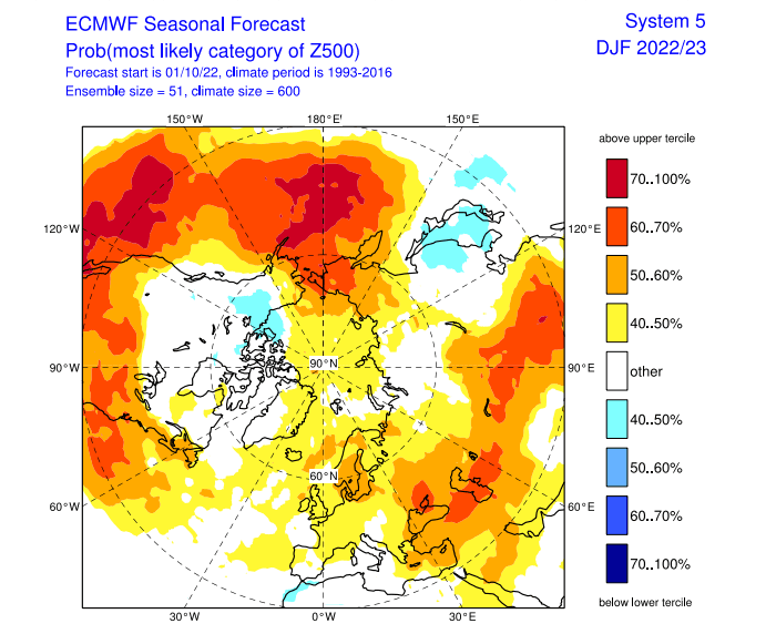 Modélisation de l'anomalie de géopotentiels pour l'hiver 2022-2023 - via ECMWF