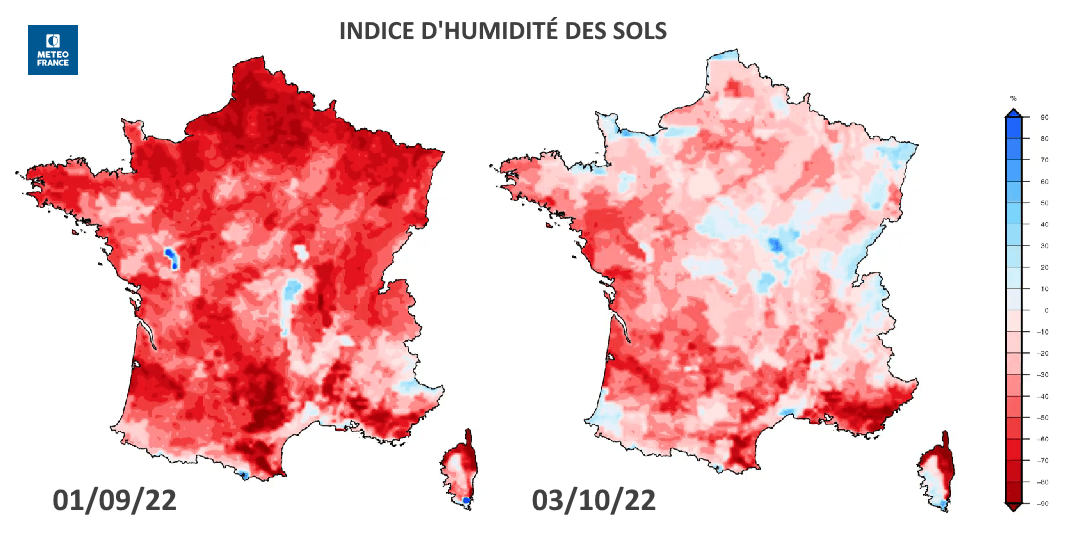 Écart à la normale de l'indice d'humidité des sols au 1er septembre et au 3 octobre 2022 - via Météo France