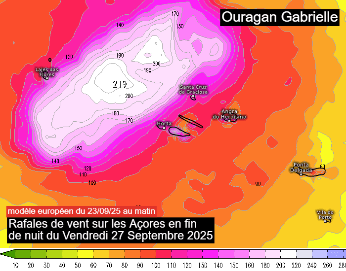 Ce sont les îles du nord-ouest de l'archipel qui sont les plus exposées au passage de l'ouragan Gabrielle. Il s'agit notamment de Corvo et Flores, les plus au nord-ouest, mais aussi des îles Faial, Pico, Graciosa, São Jorge, et Terceira. Certains scénarios sont inquiétants, comme celui du modèle européen de ce mardi matin, avec des rafales qui pourraient atteindre les 200 km/h dans les parages de ces îles ! Cette prévision sera à affiner mais un risque notable existe pour les Açores.
