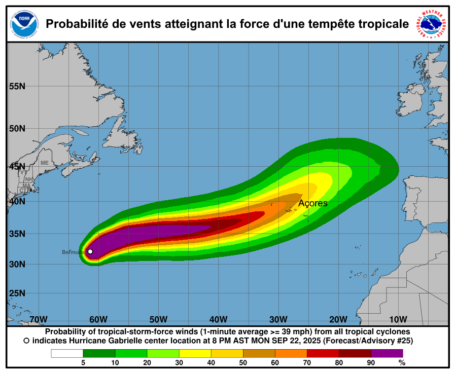 Le cône ci-dessous correspond à la probabilité d'enregistrer des vents atteignant au moins la force d'une tempête tropicale. On constate que l'archipel des Açores est fortement exposé, notamment ses îles nord-ouest où les probabilités d'avoir des vitesses de vent dignes d'une tempête tropicale sont jugées de 60 à 70% selon le dernier bulletin du NHC américain. La période à risque couvre surtout la nuit de jeudi à vendredi et la matinée du vendredi 26 septembre 2025.
