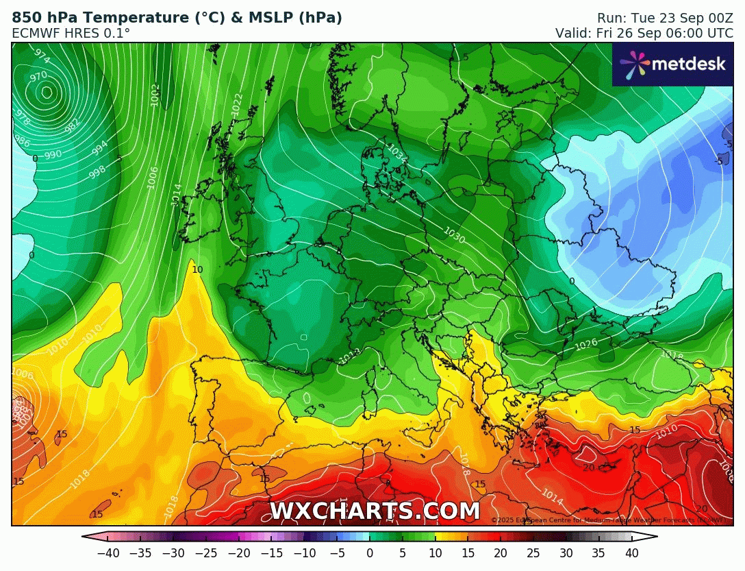 Masse d'air à 850 hPa (vers 1500m) du vendredi 26 au dimanche 28 septembre 2025 - wxcharts.com