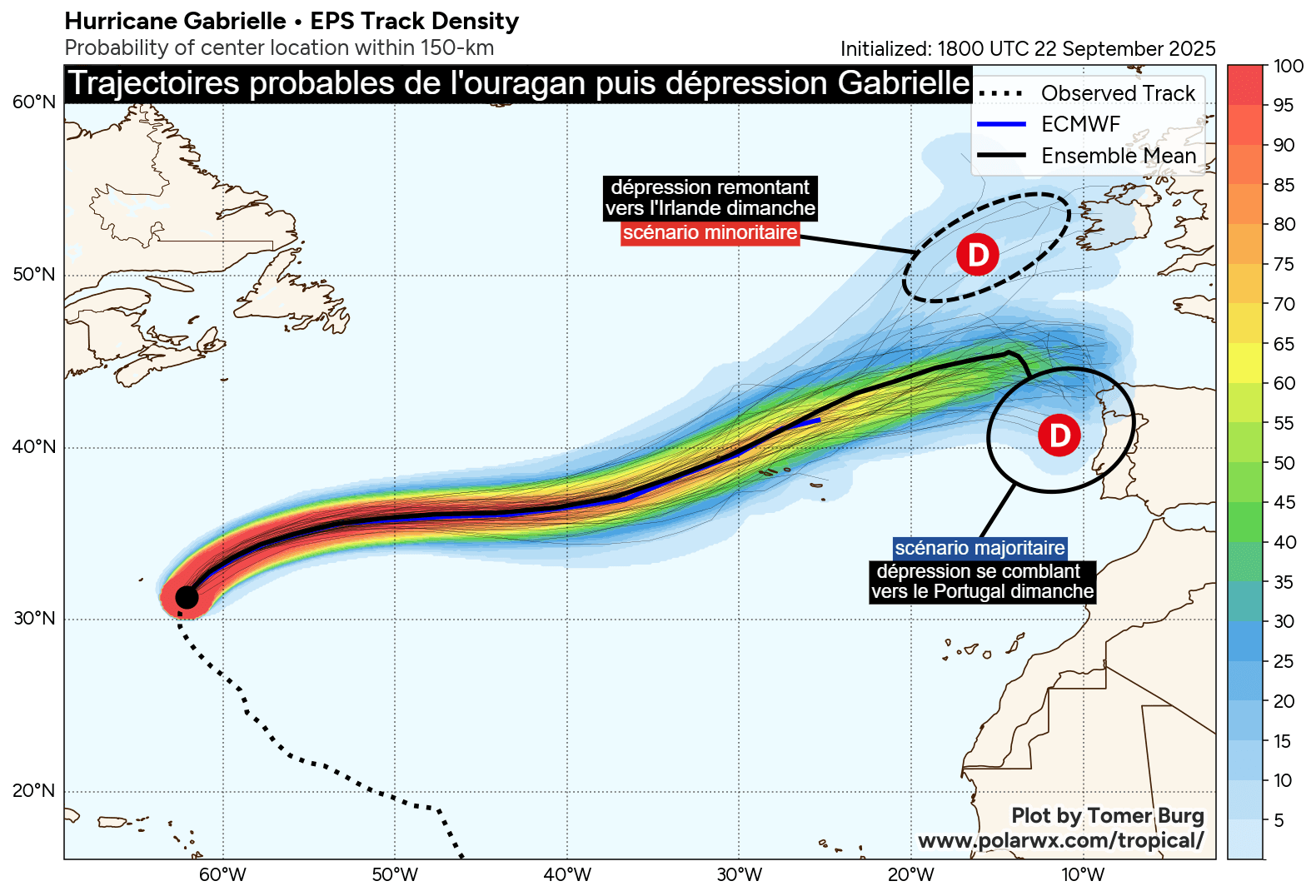 Trajectoires probables de l'ouragan puis de la dépression Gabrielle jusqu'au dimanche 28 septembre 2025 - polarwx.com