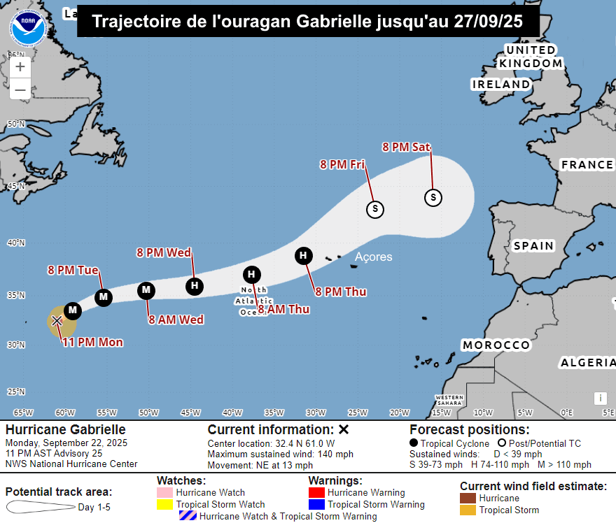 L'ouragan Gabrielle s'est nettement intensifié en ce début de semaine, atteignant la catégorie 4 ce lundi 22 septembre 2025. Il est ainsi devenu le deuxième ouragan majeur (catégorie 3 ou plus) de la saison 2025 sur l'Atlantique. Il circule actuellement à plusieurs centaines de kilomètres à l'est des Bermudes et migre désormais vers l'est en prenant la direction de l'Europe. Comme on le voit sur la carte ci-dessous, l'archipel des Açores pourrait être impacté dès la nuit de jeudi à vendredi.