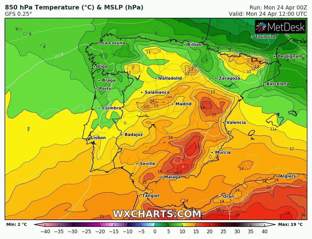 La hausse se poursuivra le lendemain avec des pointes à plus de 35-36°C entre le Sud du Portugal et le Sud de l'Espagne, les 30°C devraient également être atteints jusqu'à Madrid voire jusqu'à l'intérieur de la Catalogne.