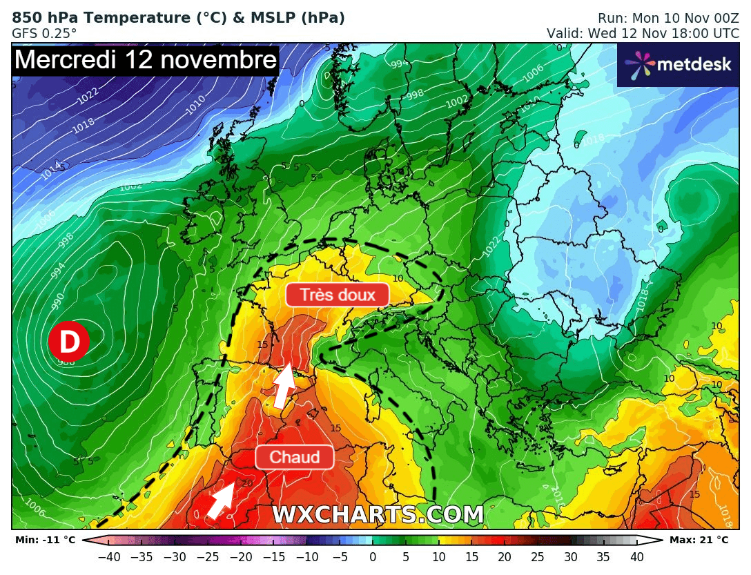 Si la masse d'air s'annonce particulièrement douce en altitude, elle le sera également près du sol avec des températures s'élevant progressivement dans les prochains jours pour atteindre un pic entre jeudi et vendredi. On pourra ainsi dépasser les 20 voire 22°C jusque sur la moitié nord jeudi et même atteindre voire dépasser le seuil de chaleur (25°c) sur le sud et notamment le sud-ouest de la France.