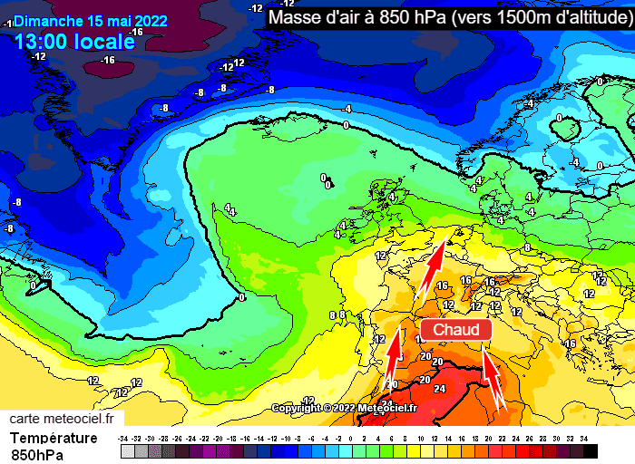 Masses d'air à 850 hPa (vers 1500m) le dimanche 15 mai 2022 - via meteociel.fr