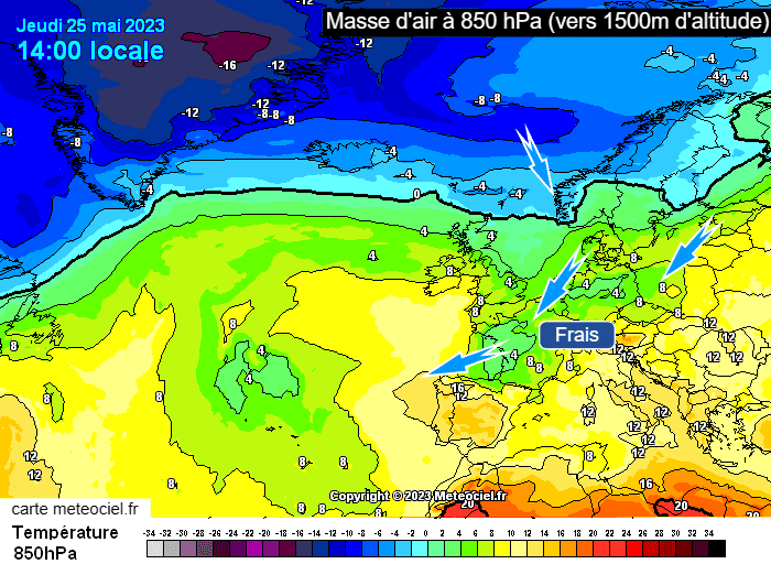 Masses d'air à 850 hPa (vers 1500m) ce jeudi 25 mai 2023 - via meteociel.fr