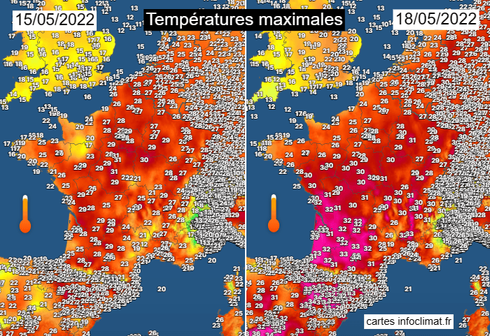 Températures maximales mesurées les 15 et 18 mai 2022 - cartes infoclimat.fr