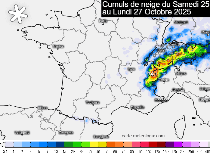 L'air frais de dimanche sera favorable à la neige dès 1000-1200 mètres mais les averses seront peu actives. Les cumuls qui concerneront le Massif Central s'annoncent donc faméliques. Dans les Vosges et le Jura, on peut attendre quelques centimètres tout au plus et parfois 10 cm dans le nord des Alpes. L'épisode marquant sera surtout celui de lundi 27 octobre 2025 avec des quantités bien plus importantes dans les massifs nord-alpins. Il neigera d'abord sous 1000 mètres en début de front puis la limite remontera vers 1800 voire 2000 mètres. À ces altitudes, il pourra tomber 20 à 40 cm. Depuis vendredi, les stations situées à 2000m ou plus pourront donc totaliser 50 à 70 cm !
