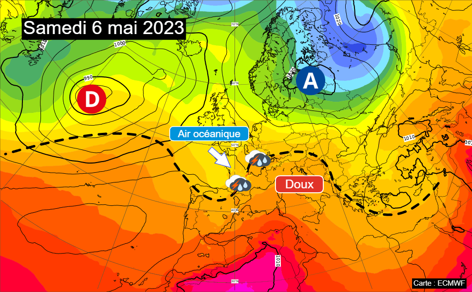 C'est en journée de samedi 6 mai que les orages les plus nombreux et les plus forts sont attendus. L'air océanique devrait s'écouler plus franchement sur le pays avec la formation d'un petit creux dépressionnaire en journée sur le Sud de la France. De plus, l'instabilité atmosphérique devrait se montrer plus marquée que les jours précédents, notamment du Sud-Ouest au Massif Central, apportant un risque d'orages parfois forts sur ces régions en fin de journée.