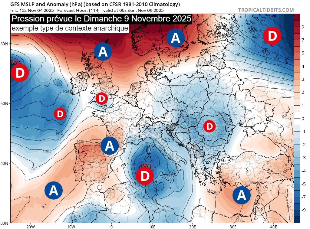 Parfois, la circulation atmosphérique est bien définie avec un anticyclone sur les Açores et des basses pressions sur le nord de l'Europe. En revanche, il existe des situations où tout est bien plus chaotique, comme en ce moment. Comme on le voit sur la carte ci-dessous, les zones de hautes et de basses pressions sont de faible dimension et très volatiles, ce qui rend la prévision à plusieurs jours particulièrement délicate. En effet, il suffit d'un décalage de quelques centaines de kilomètres d'un de ses centres d'action - ce qui n'est rien à 4 ou 5 jours d'échéance - pour totalement modifier la prévision de votre région.