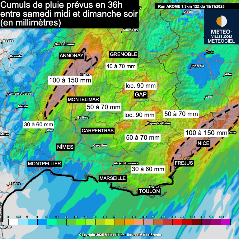 Les cumuls de précipitations prévus devraient être comparables à ceux enregistrés ces dernières heures sur les Cévennes ardéchoises, mais probablement supérieurs à ceux de samedi dans la Drôme et significativement plus importants dans l’arrière-pays azuréen, sur les hauteurs entre Fréjus, Nice et Menton.  Sur cette zone géographique, il est envisageable de dépasser largement les 100 mm en 24 heures.