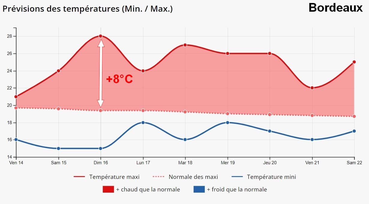 Évolution des températures maximales et minimales à Bordeaux dans les 8 prochains jours – Météo-Bordeaux