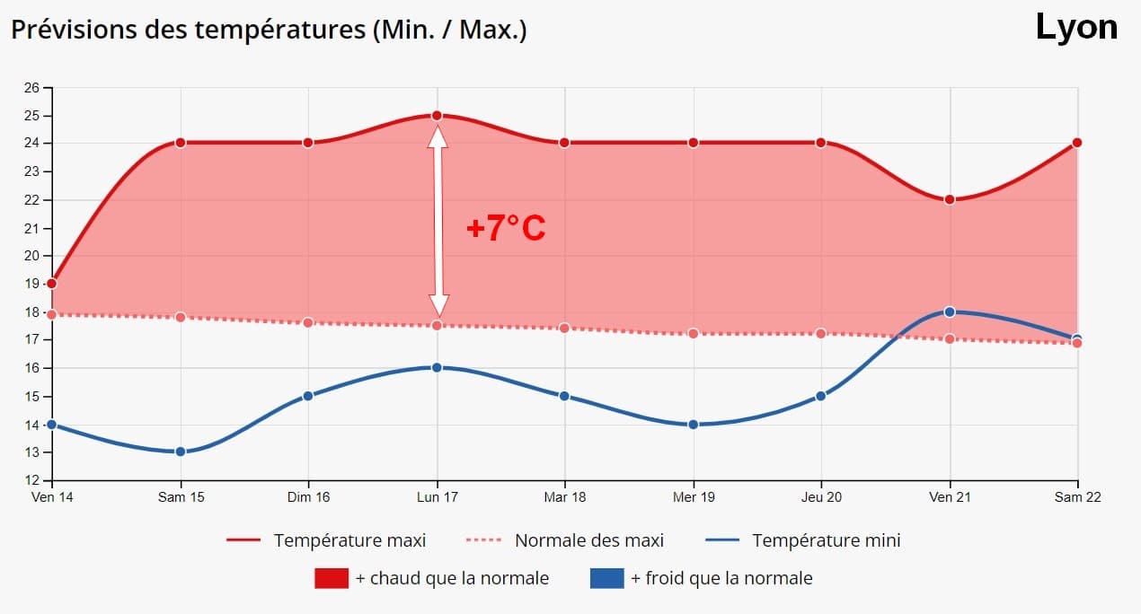 Si la chaleur s'annonce plus marquée sur le Sud-Ouest, les autres régions seront également soumises à des températures très élevées pour la période. Du côté de Lyon, les maximales vont largement se réchauffer dès demain, se trouvant là aussi situées plus de 6 à 8°C au-dessus des normales de la période la semaine prochaine.