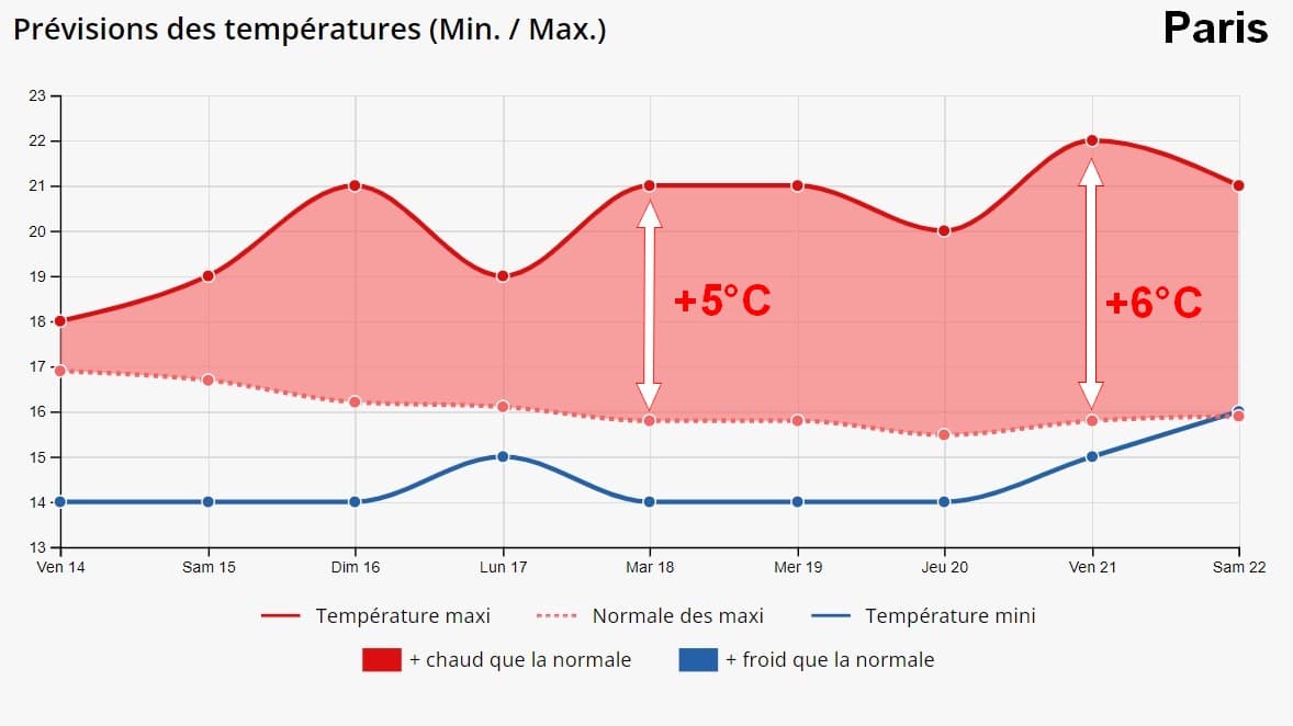 Même constat du côté de Paris où le seuil de chaleur (25°C) ne sera pas atteint mais où les températures maximales plus de 4/5°C au-dessus des normales de la période.