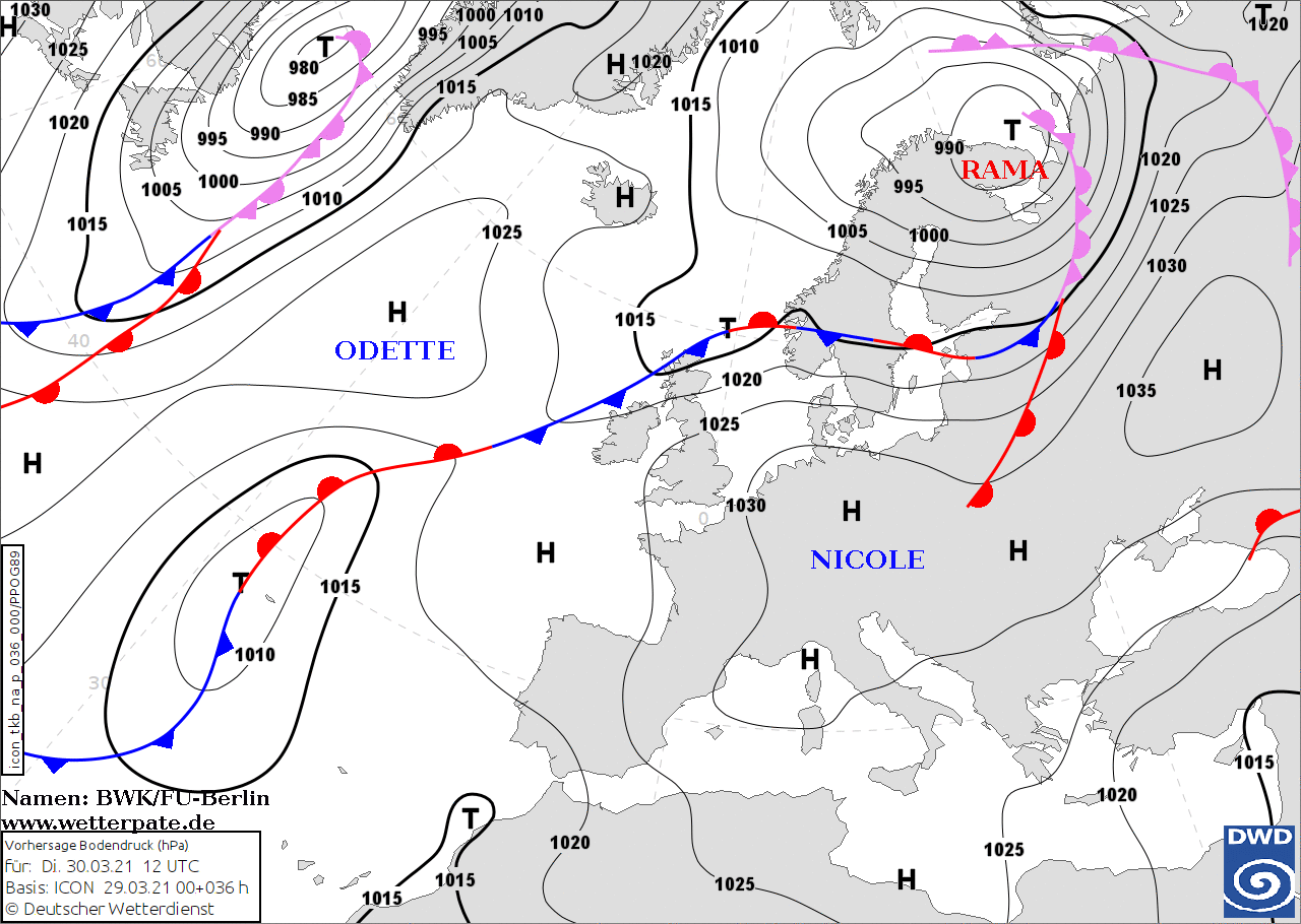 Noms des dépressions et anticyclones prévus pour mardi 30 mars 2021 à midi (Berlin)