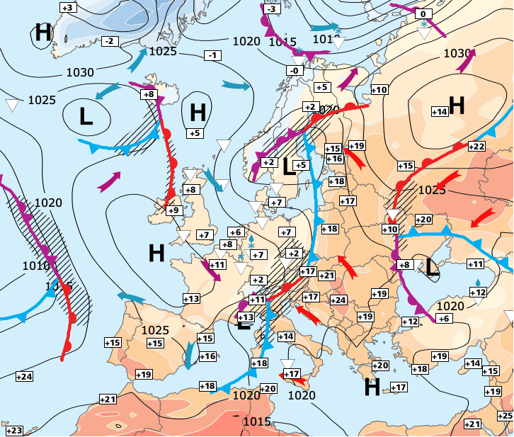 Noms des dépressions et anticyclones prévus pour mercredi 14 avril 2021 à midi (Berlin)
