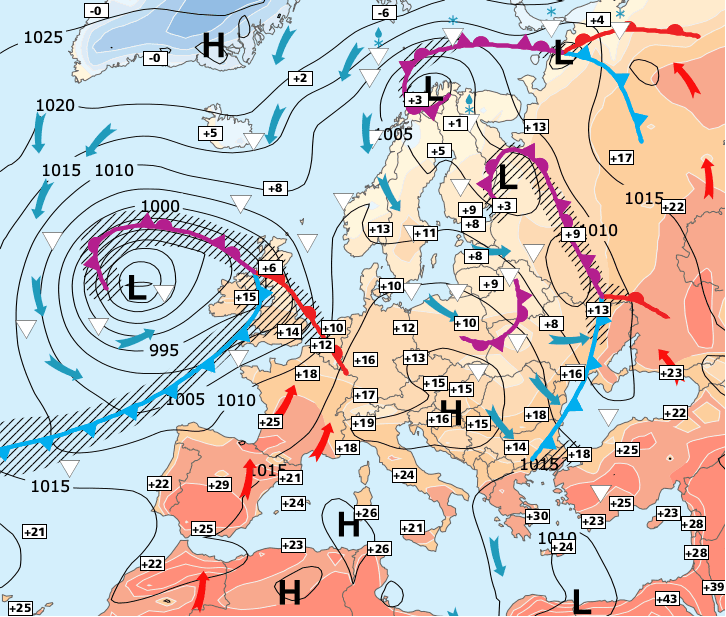 + Le conflit avec l'air plus chaud qui résistera à l'avant provoquera la formation d'une zone d’orages en deuxième partie de journée de dimanche entre les Pyrénées et la Belgique.