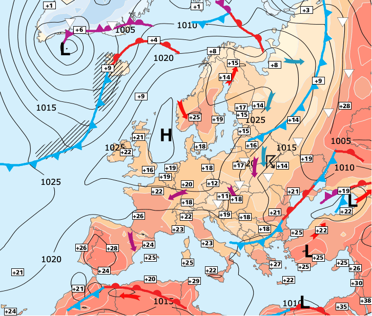 + La situation météo devient très estivale car l’anticyclone d'Europe du Nord s’est largement imposé sur une grande partie du continent, véhiculant de l’air sec sur la France.