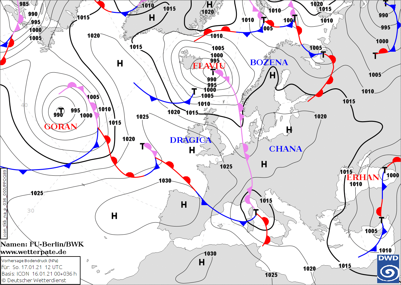 Noms des dépressions et anticyclones prévus pour dimanche 17 janvier 2021 à midi (Berlin)