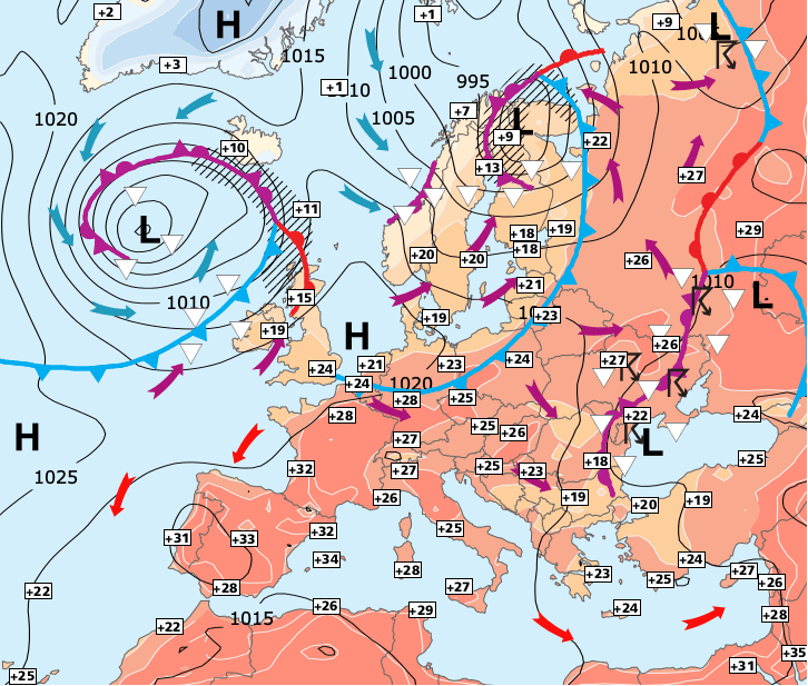 + Une descente d’air très frais est en train de s’organiser sur le Nord de l’Atlantique, ce qui va propulser la remontée d’air très chaud en provenance du Sahara vers nos régions.