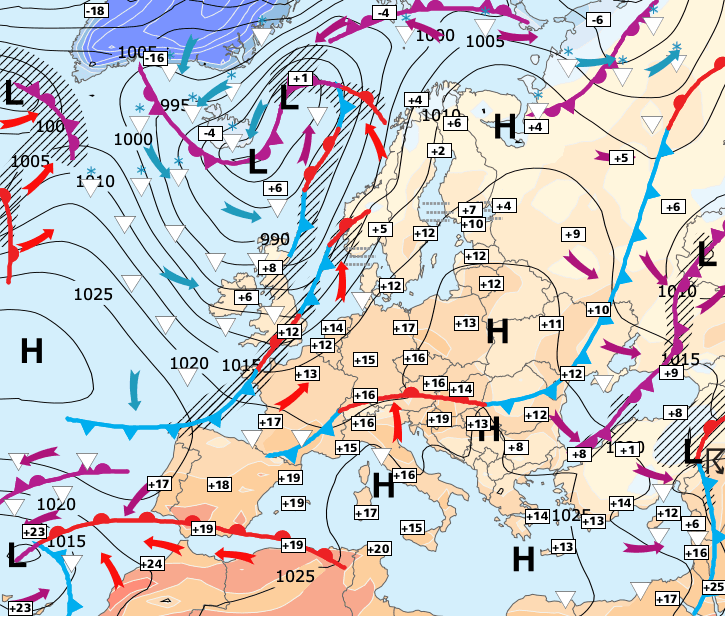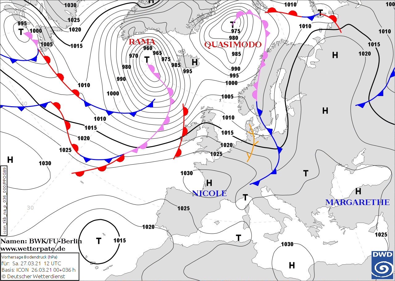 Noms des dépressions et anticyclones prévus pour samedi 27 mars 2021 à midi (Berlin)