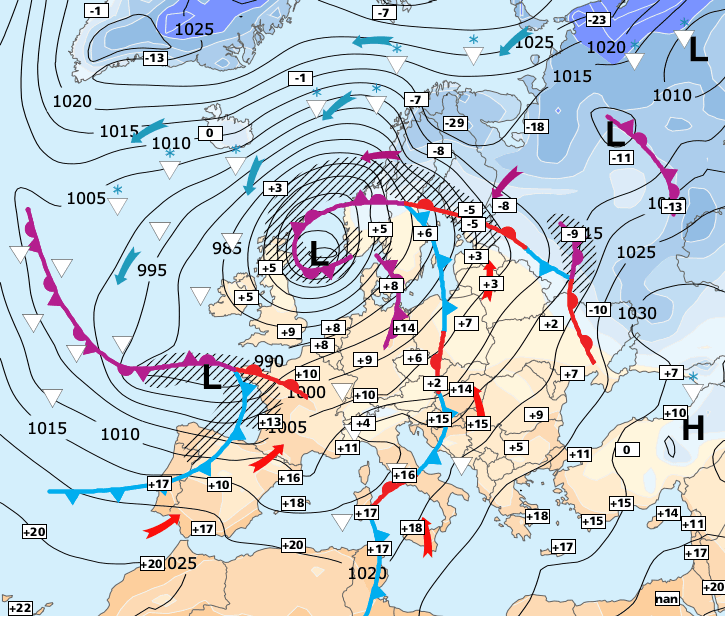 Noms des dépressions et anticyclones prévus pour vendredi 22 janvier 2021 à midi (Berlin)