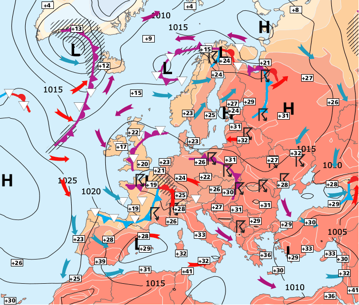 Noms des dépressions et anticyclones prévus pour mardi 13 juillet 2021 à midi (Berlin)