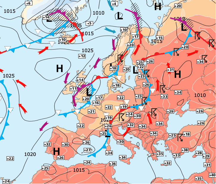 Noms des dépressions et anticyclones prévus pour samedi 26 juin 2021 à midi (Berlin)